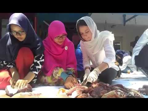 Empat mahasiswa dari Eropa ikut memotong daging hewan kurban di Kampus Universitas Surabaya (Ubaya). Mereka menggunakan sarung tangan karet agar tak bersentuhan langsung dengan daging kurban.